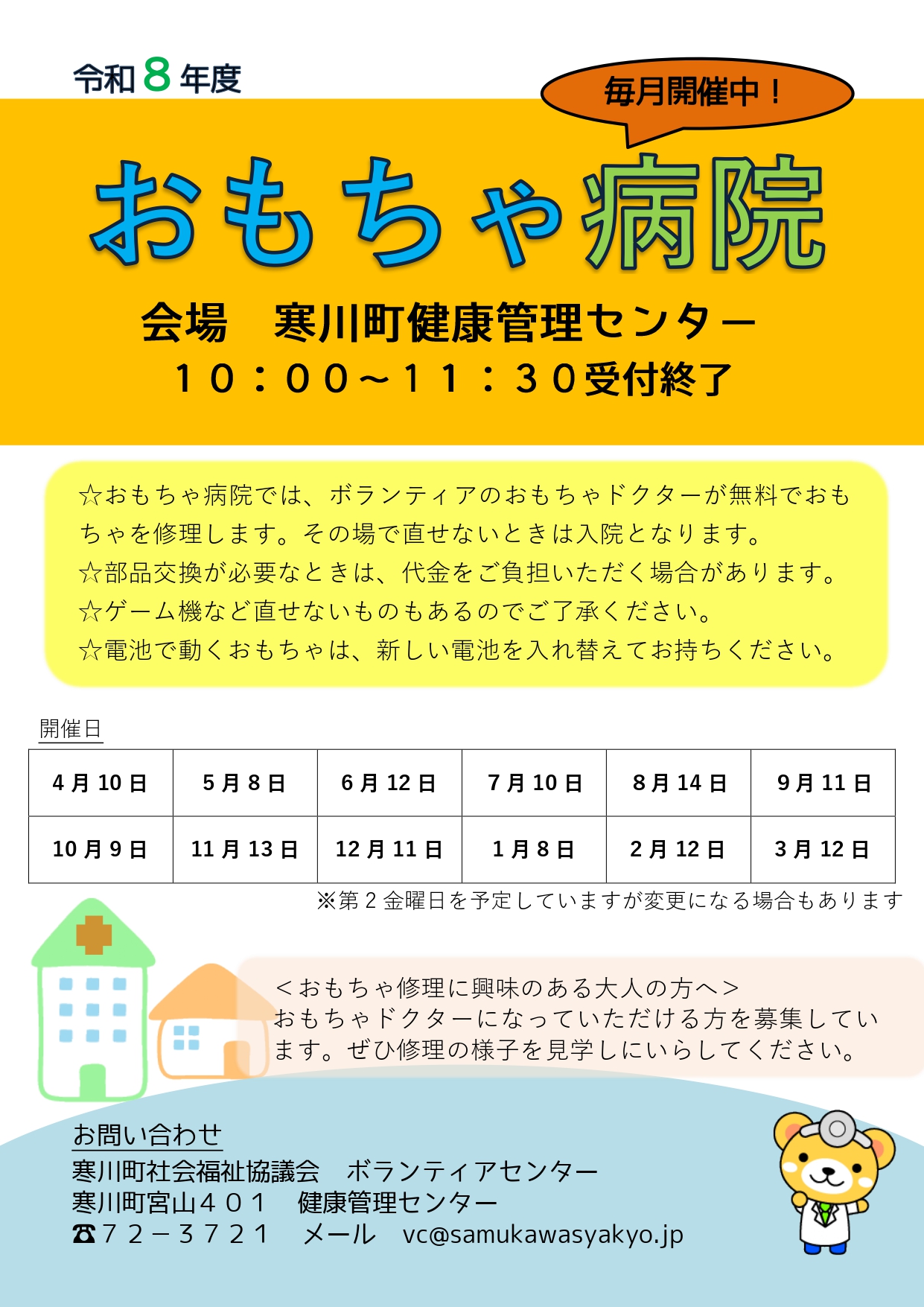『おもちゃ病院』は、ボランティアのおもちゃドクターがおもちゃを修理してくれるボランティア活動です。修理して欲しいおもちゃがありましたら、ぜひ『おもちゃ病院』にご相談ください。