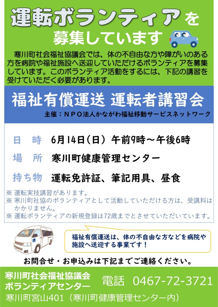運転ボランティアの活動をしませんか?【福祉有償運送・運転者講習6/14】